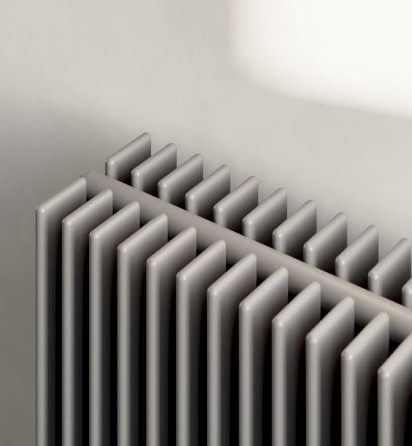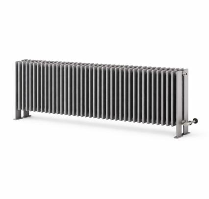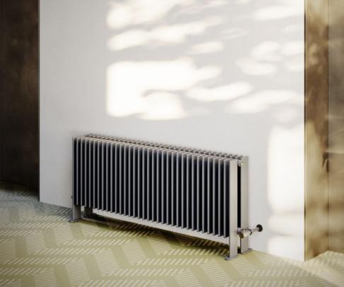 Lamelový radiátor na nožičkách s oválnymi profilmi 70x11 mm na kolektoroch Ø 35 mm. Nožičky sú vysoké 100 mm.